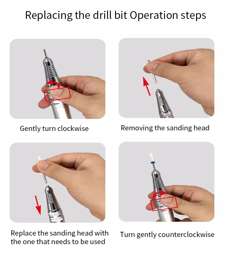 This 30,000 rpm electric nail drill replacement drill operation method, that is, plug and pull out, easy and convenient, replacement can be used after completion.