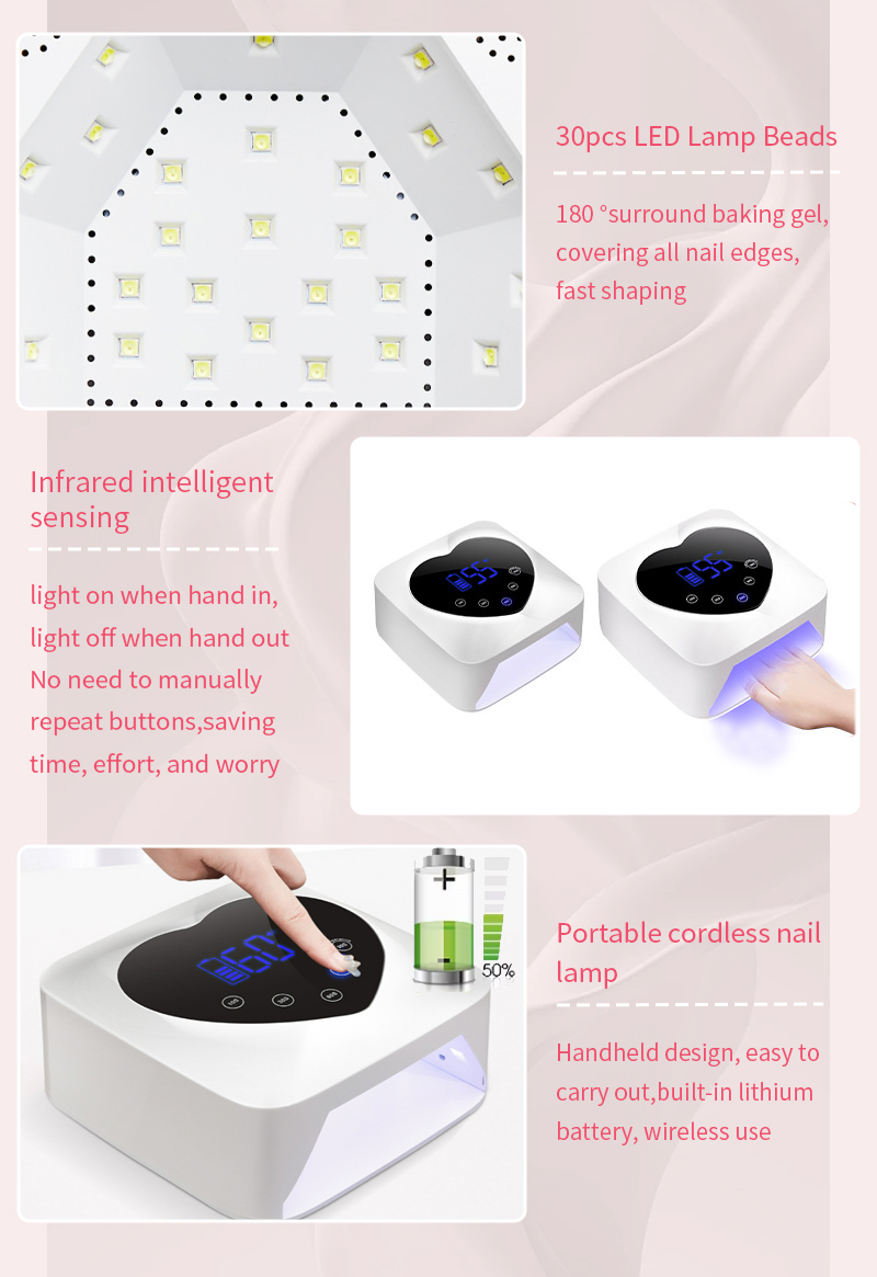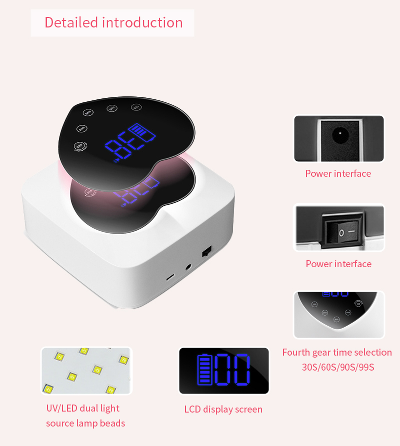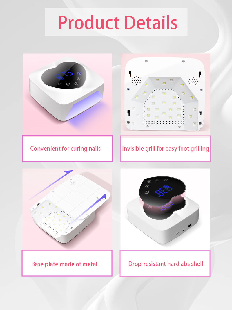 The product ensures even glue drying without shrinkage. Its dual light sources provide gentle heating to prevent hand discoloration and eye strain, suitable for both hands and feet, delivering remarkably fast drying results.