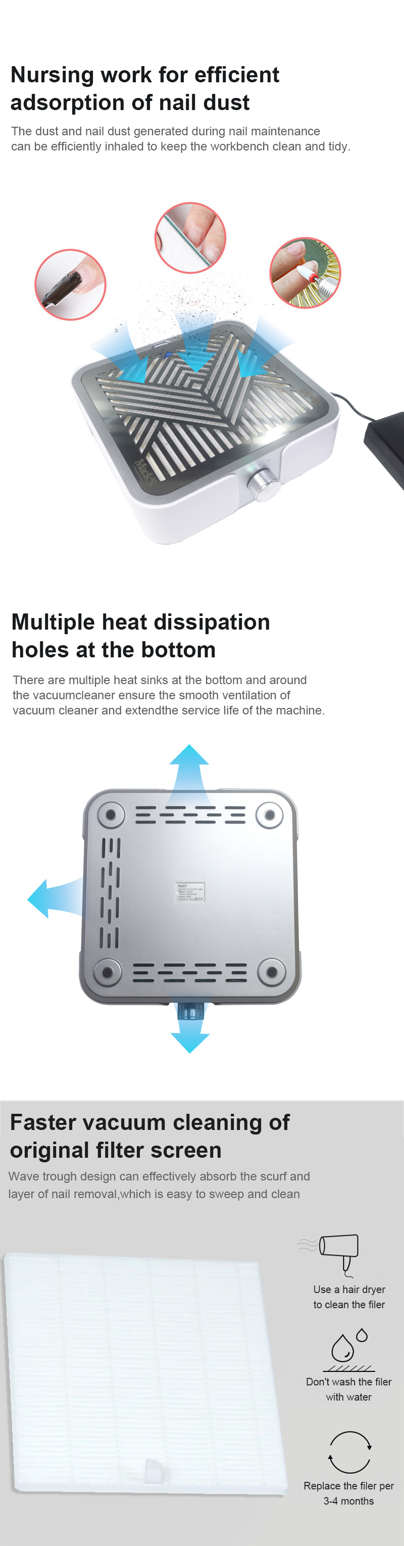 Products strong adsorption of nail debris does not leak dust, keep the countertop clean and tidy, fast vacuuming does not leak dust high power more efficient.