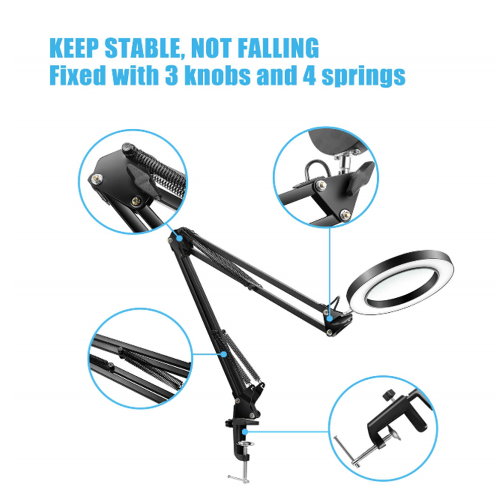 This foldable 360-degree rotating magnifying desk lamp features an elegant and refined design. Its gentle light is easy on the eyes, simulating the soft, natural light of dawn for comfortable, glare-free illumination. Suitable for multiple applications including tattooing, embroidery, and nail art.