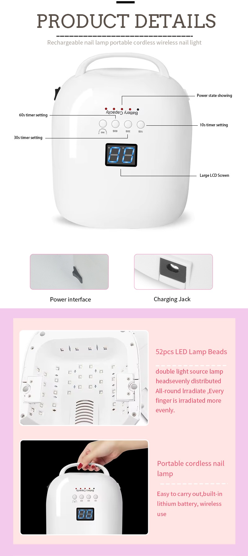 The Handheld Portable Gel Nail Drying Lamp delivers 86 watts of curing power through high-quality LED bulbs rated for 50,000 hours of operation. This substantial power output enables rapid 10-second curing for most gel formulations, significantly reducing service times compared to lower-wattage alternatives. The cordless design, powered by a rechargeable battery, eliminates the constraints of power outlets, allowing technicians to work freely in any location.