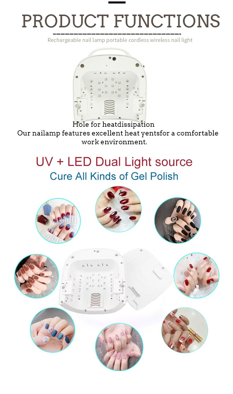 Handheld Portable Gel Nail Drying Lamp ensures even glue drying without shrinkage. Its dual light sources provide gentle heating to prevent hand discoloration and eye strain, suitable for both hands and feet, delivering remarkably fast drying results.