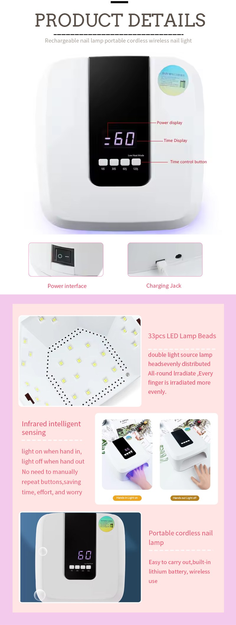 The 33 high-power LED beads are rated for approximately 50,000 hours of operation. In a typical salon environment with daily use, this translates to several years of reliable service before any noticeable reduction in curing efficiency. The LED beads are integrated into the lamp’s circuitry and are designed to outlast the typical product lifecycle. Unlike older UV lamp technologies that required periodic bulb replacements, this maintenance-free design eliminates ongoing consumable costs and ensures consistent curing performance throughout the lamp’s life.