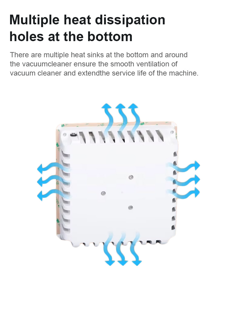 The bottom of the product has cooling holes for smooth ventilation, and the vacuum cleaner is designed with multiple cooling vents on the bottom and all around to ensure smooth ventilation and extend the life of the machine.