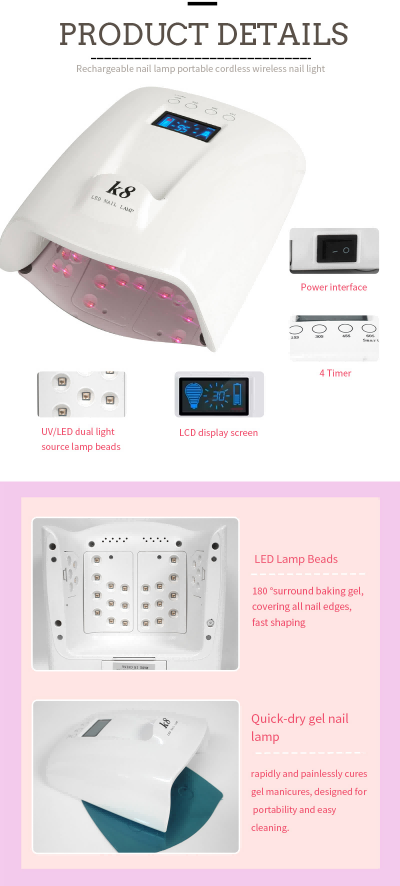 Large-Capacity Nail Drying Lamp with Handle ensures even glue drying without shrinkage. Its dual light sources provide gentle heating to prevent hand discoloration and eye strain, suitable for both hands and feet, delivering remarkably fast drying results.