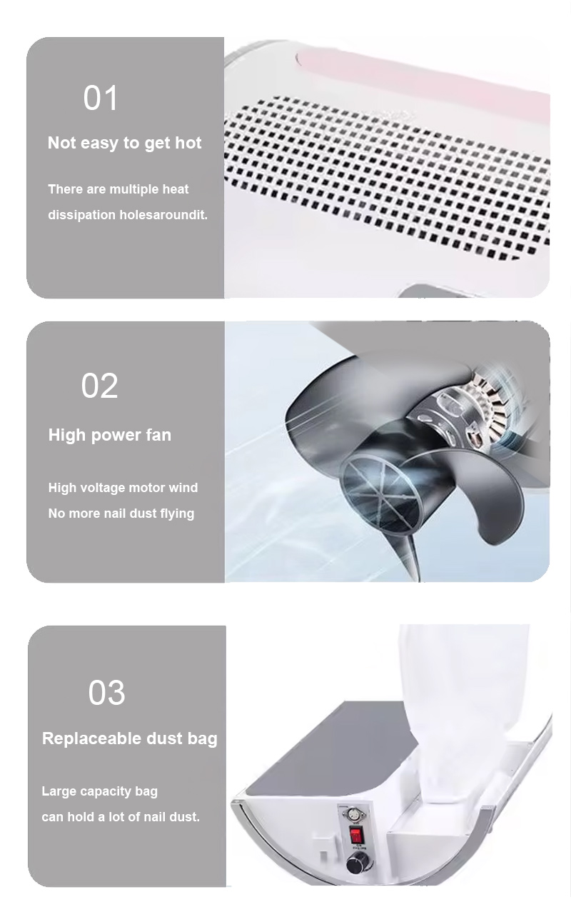 A basic dust collector simply pulls air. A multifunctional nail dust collector goes further by combining high suction power, adjustable airflow angles, and additional features like LED lighting or dual fans. This design allows professionals to switch between heavy filing and delicate e-file work without losing efficiency.