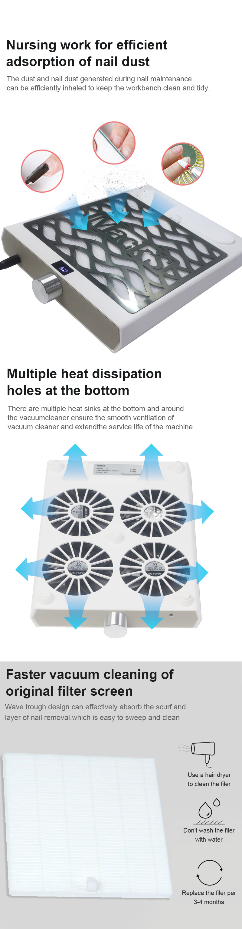 Products strong adsorption of nail debris does not leak dust, keep the countertop clean and tidy, fast vacuuming does not leak dust high power more efficient.