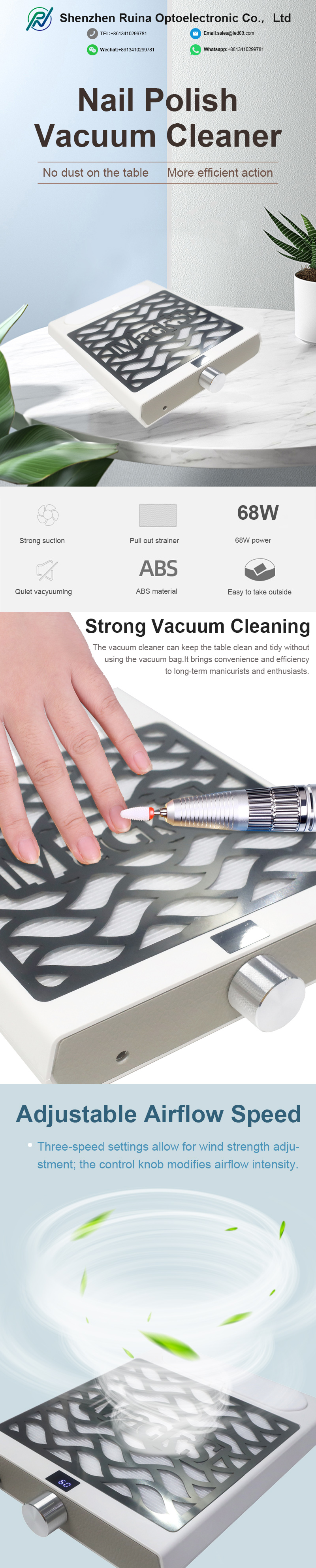 한국어Shenzhen Ruina Optoelectronic Co.,Ltd. a leading China Nail Dust Collector with Hand Rest manufacturer, supplier and exporter. Adhering to the pursuit of perfect quality of products, so that our Nail Dust Collector with Hand Rest have been satisfied by many customers. Extreme design, quality raw materials, high performance and competitive price are what every customer wants, and that's also what we can offer you. Of course, also essential is our perfect after-sales service.