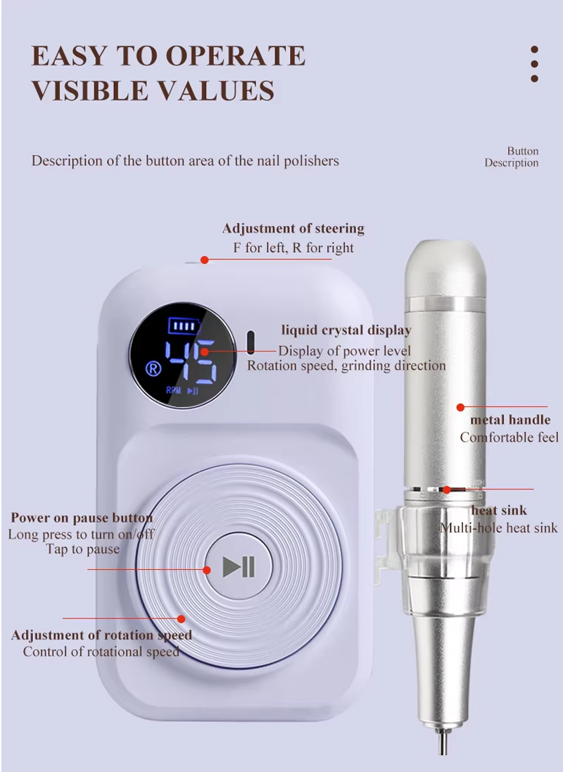 This premium low-noise grinding pen display design, with sanding pen socket, LCD liquid crystal display can show the number of revolutions/power/direction, speed switch knob, clockwise/counterclockwise toggle button, pause button, 30,000 rpm professional motor, screw-in locking grinding head.