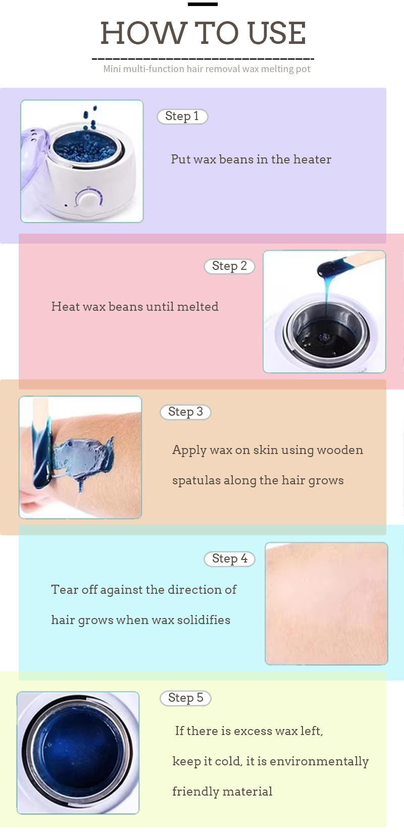 Product depilatory wax operation method, the higher the temperature the faster the wax melts, the lower the temperature the slower the wax melts, first pour into the appropriate amount of depilatory wax beans, heating until the wax beans melt, then depilatory parts of the uniformly coated depilatory wax, and finally against the direction of hair growth tear off.